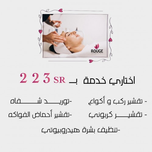 اختاري خدمة ( تقشير كربوني او تقشير احماض الفواكه او توريد شفايف او تنظيف بشرة عادي او 3 جلسات تشقير حواجب )